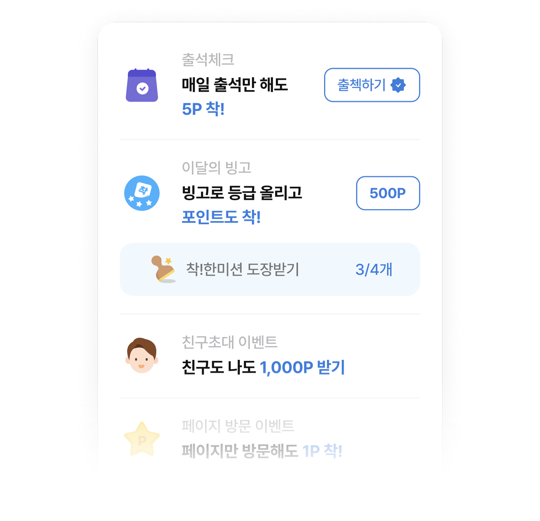 매일 다양한 미션을 달성하고 보너스 혜택들을 받아보세요